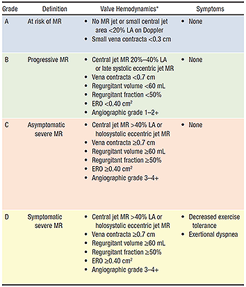 Two-dimensional and Doppler echocardiography is essential to determine the mechanism (dysfunction) and severity of mitral regurgitation. Assessment of the mitral valve hemodynamics using the ratio of jet to left atrial area 1, the regurgitant volume (Rvol: the difference between the mitral and aortic stroke volumes) and effective regurgitant orifice (ERO: ratio of regurgitant volume to regurgitant time velocity integral) are useful tools in grading the severity of MR (Table 12), when integrated with clinical findings. Recent guidelines published by the AHA/ACC joint committee propose a more integrative MR severity grading system ranging from grade A (least severe) to grade C, which defines MR as at risk, progressive, asymptomatic severe and symptomatic severe (Table 2)3